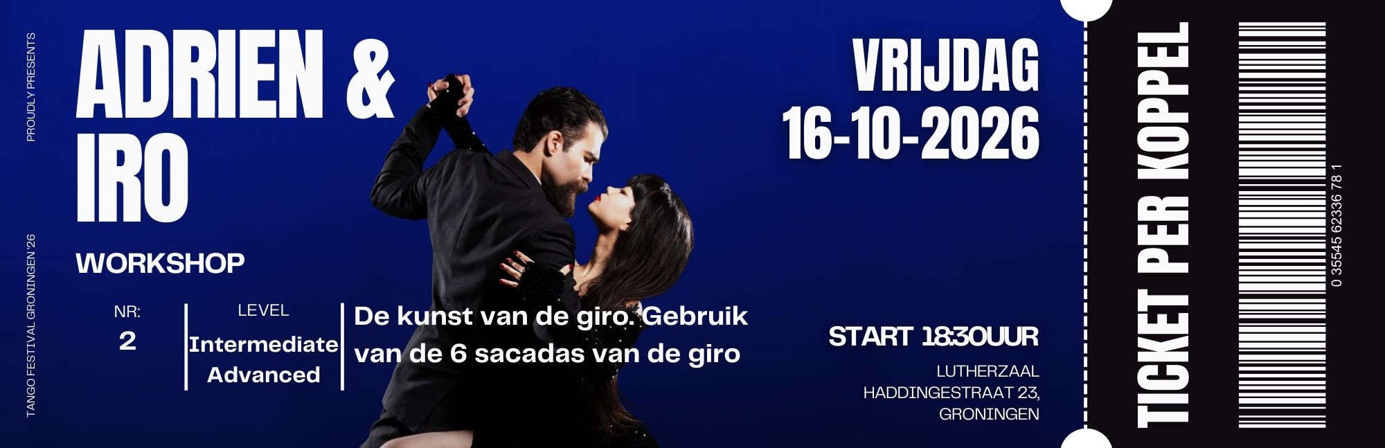 Let op: het workshopticket bestel je als lespaar. Het ticket staat op één naam, maar het geeft leider en volger gezamenlijk toegang tot de workshop. We verwerken je bestelling binnen 2 weken. Je ontvangt een bevestiging per email zodra we je naam hebben toegevoegd aan de deelnemerslijst van deze workshop. Maximaal 15 lesparen, zolang de voorraad strekt.